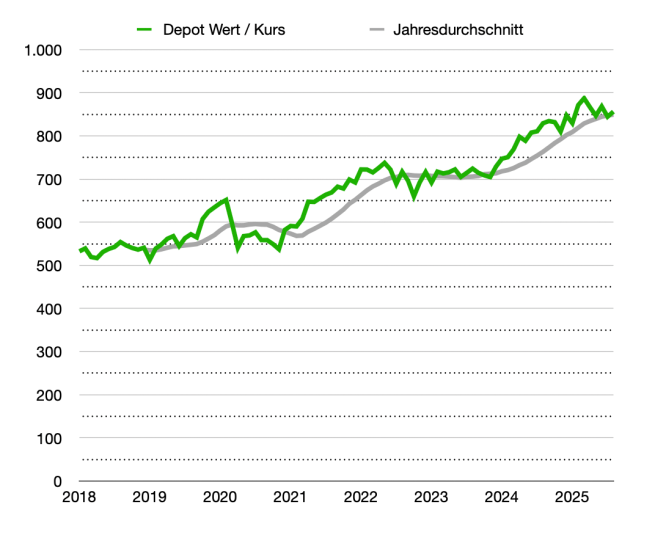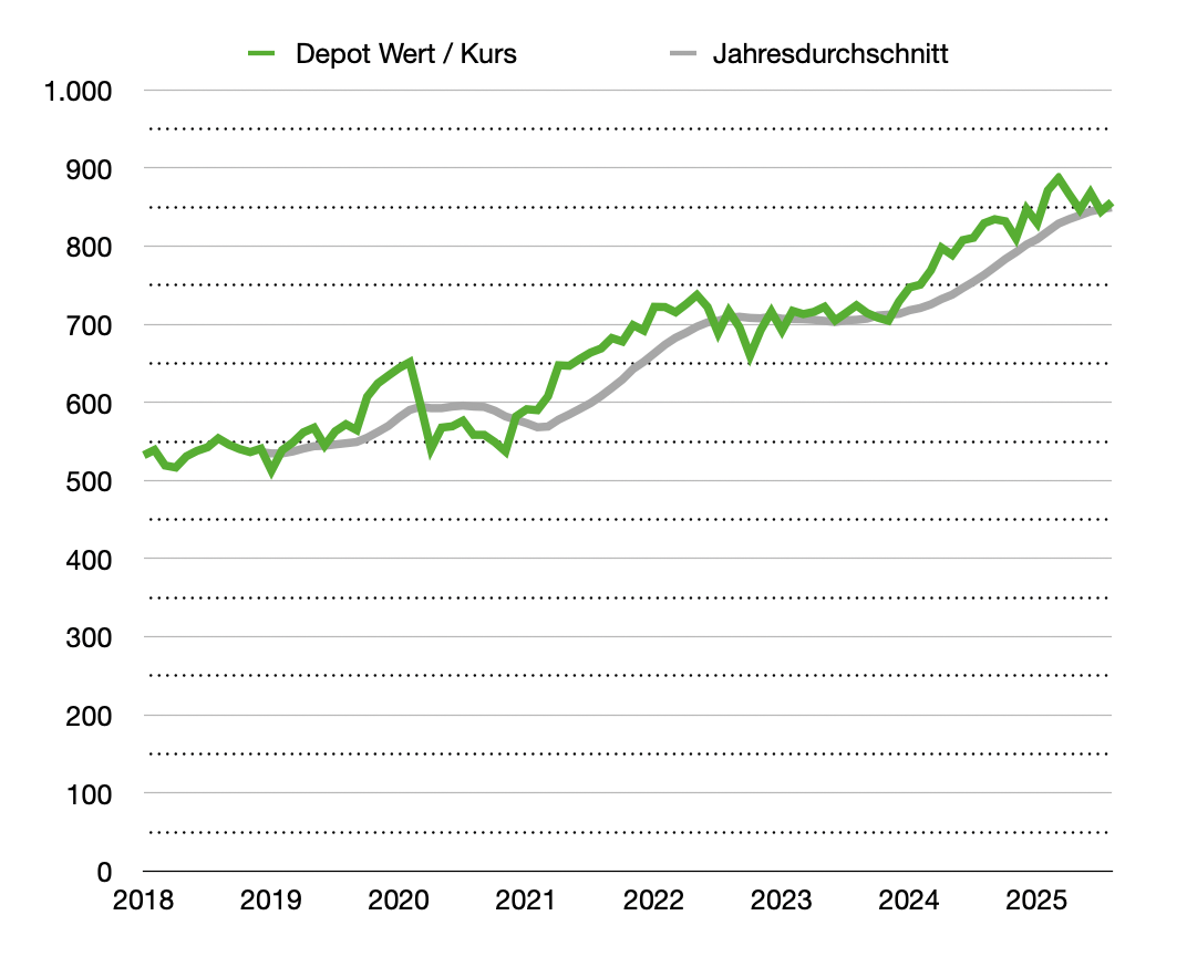 Der Corona Crash ist rückblickend klar ersichtlich und auch die Zölle von Donald Trump im April 2025 haben mich wieder auf einen Durchschnittswert zurück geführt ☺️