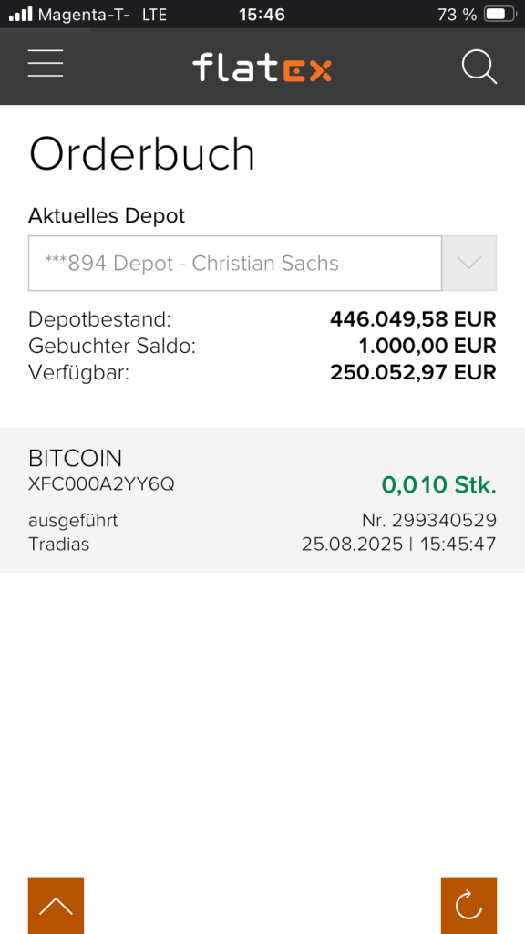 Neu dazugekommen ist dass Flatex AT nun Kryptohandel anbietet. Ich habe mal in meinem Kurzurlaub eine Kauforder abgesetzt: