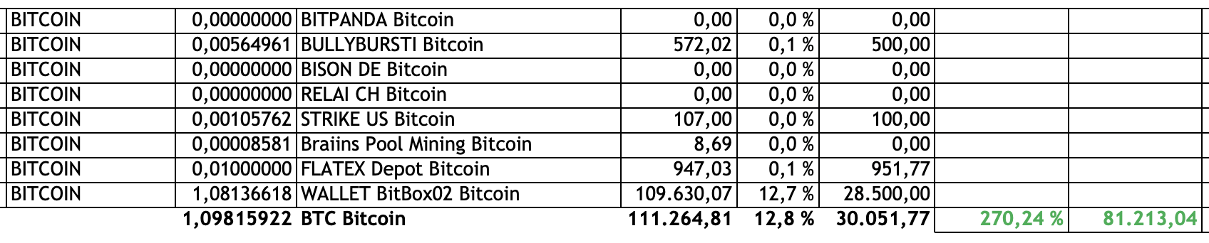 Nun zum finanziellen. Vorab jeder kennt die Regel für Bitcoin: Not your key, not your Coin! Ich erfülle dies mit meiner BitBox02 und Bullybursti aber nicht immer. Aber zu 100% Bitcoin 🧡