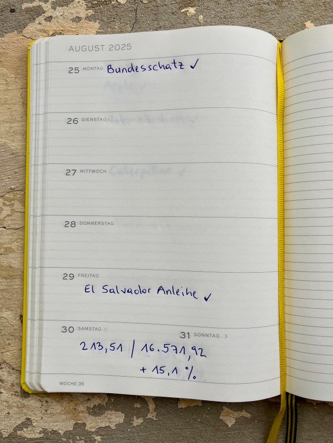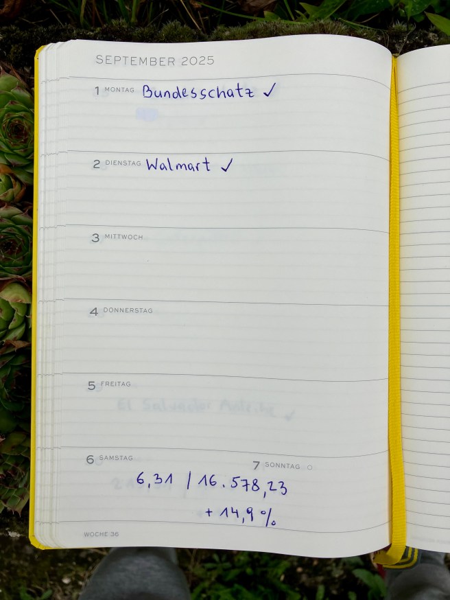 Vor dem Monatsbericht August – https://bergfahrten.com/2025/08/30/august-2025-monatsbericht-gesamtportfolio-862k-sparplane-eine-insolvenz-und-nachkauf-bitcoin-😎/ – habe ich die Kalenderwoche ausfallen lassen. Daher packe ich jetzt die letzte August und erste Septemberwoche zusammen.