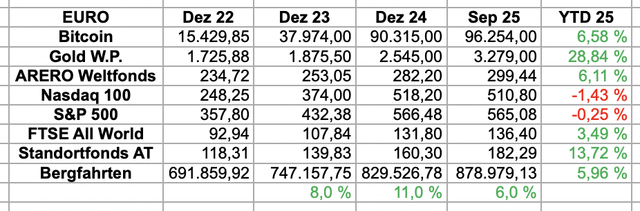 September Monatsende, wegen Verkäufen von „Diverse“ den Stand auf 54 Positionen im Bergfahrten Portfolio reduziert – d.s. aktuell nun 34 Einzelaktien und 20 weitere Investments. 3 Quartale vom Gesamtjahr 2025 sind nun Geschichte 😉