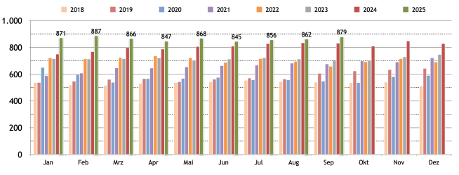 Die Ausgaben im September waren unterdurchschnittlich. Dieses Monat gab es Ausgaben von 752,49 EUR. Die E/A-Rechnung war fünf Monate in Folge positiv und dreht im Jahresverlauf ins negative. Das Gesamtjahr ist nun im Plus von +1.847,54 EUR (+11,0%) im Kalenderjahr 2025 ✅