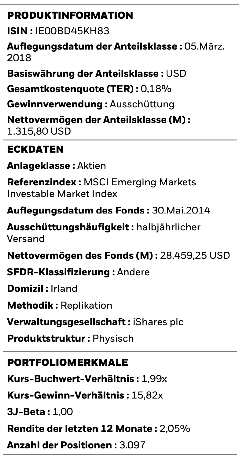 „Vielen Dank für deinen interessanten Bericht. für mich nachvollziehbar. Den $VFEM Vanguard FTEE EM hätte ich deinem $IBC3 iShares EM IMI vorgezogen, da dieser 4* statt nur 2* im Jahr Dividende zahlt und ab 7.10 auch noch günstiger ist (0,17% vs 0,18%). Gute Zeit.“