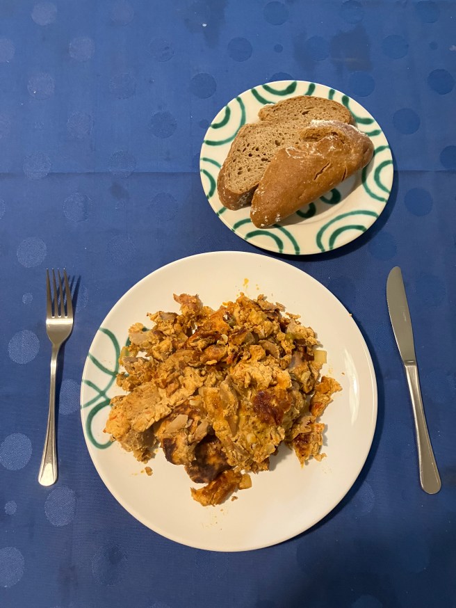 Es hätte ein Tunfisch Omelette werden sollen – leider wurde das Omelette etwas zu fluffig und zerbrach beim Versuch es zu wenden. Also musste es in der Pfanne ein Schmarrn werden 😂