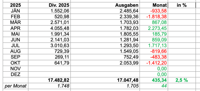 Die Ausgaben im Oktober waren wie erwartet hoch. Dieses Monat gab es Ausgaben von 2.053,99 EUR. Die E/A-Rechnung war fünf Monate in Folge positiv und dreht im Jahresverlauf ins negative. Das Gesamtjahr ist nur mehr im Plus von +435,34 EUR (+2,5%) im Kalenderjahr 2025 😅