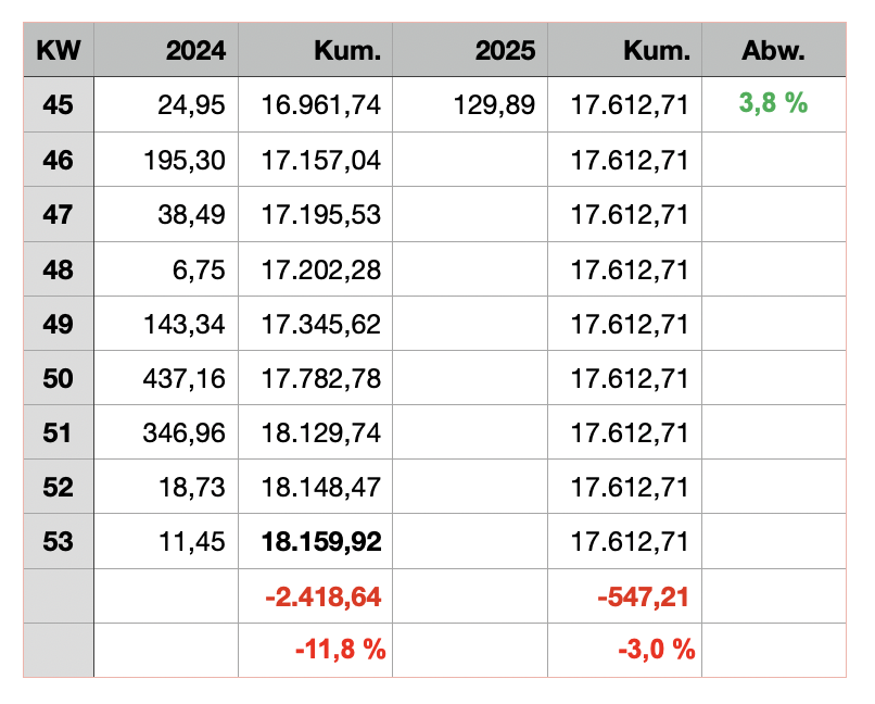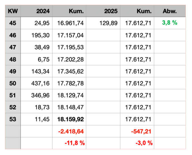 Der Vergleich mit dem Vorjahr – noch +3,8% und ein Blick in die letzten Wochen: