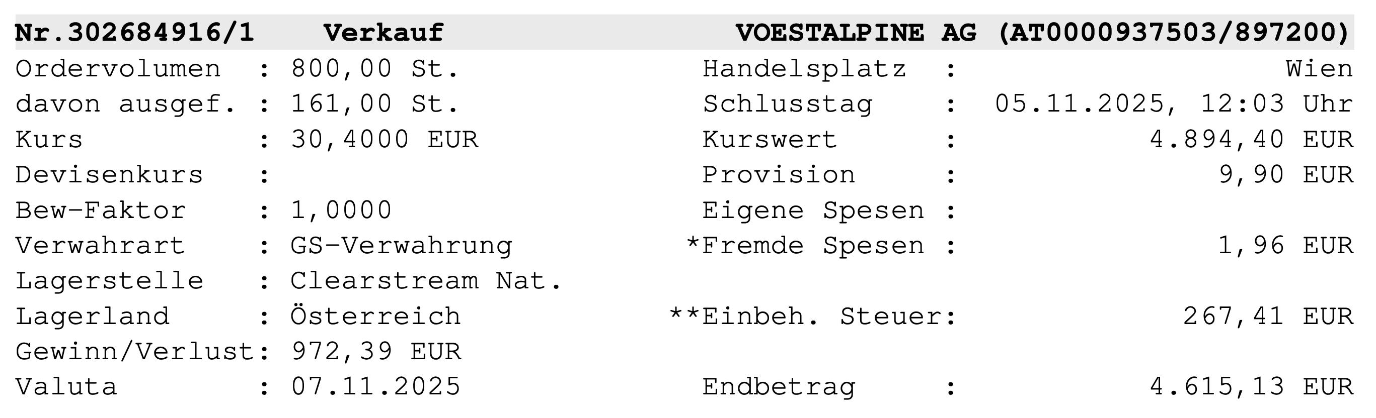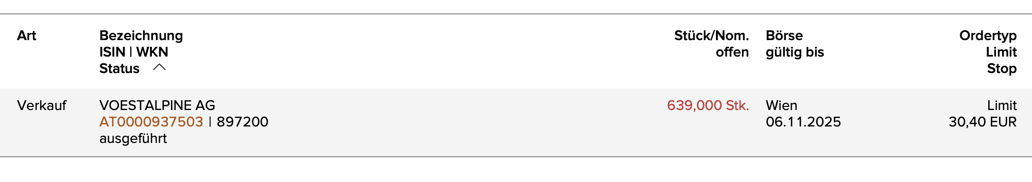 Für die Finanzierung hilft meine etwas zu groß gewordenen Voestalpine. Mischkurs zum Kauf war 24 und ich habe nun 1/3 d.s. 800 Stück um 30,40 verkauft. Damit bleiben immer noch 1.600 Stück im Portfolio für etwaige Kursanstiege 😉