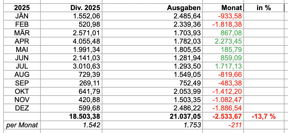 Die Ausgaben im Dezember waren wie immer zum Jahreswechsel höher. Dieses Monat gab es Ausgaben von 2.486,22 EUR. Die E/A-Rechnung war für 5 Monate positiv und 8 Monate negativ. Das Gesamtjahr ist nun im Minus bei -2.533,67 EUR (-13,7%) im Kalenderjahr 2025. Das Minus von 2,5K decken die erstmaligen Pachteinkommen für Äcker und Weingarten in 2025 👨🌾