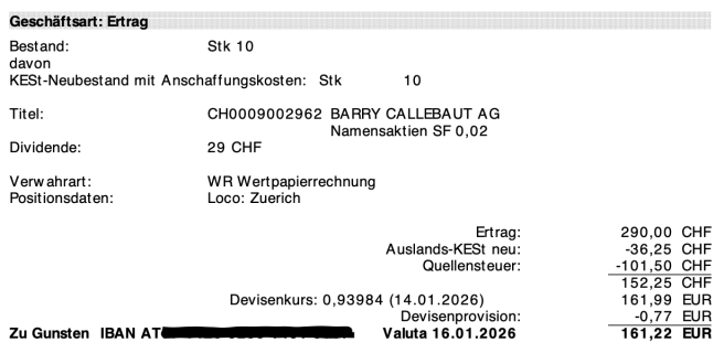 Die erste Jahresdividenden von Barry Callebaut ist heute eingetroffen – pünktlich am Zahltag, das mag ich 🇨🇭
