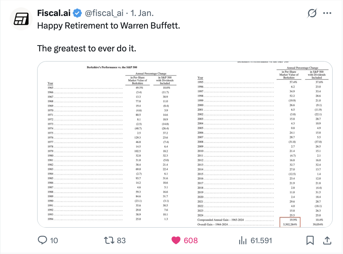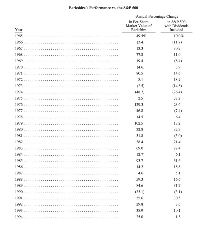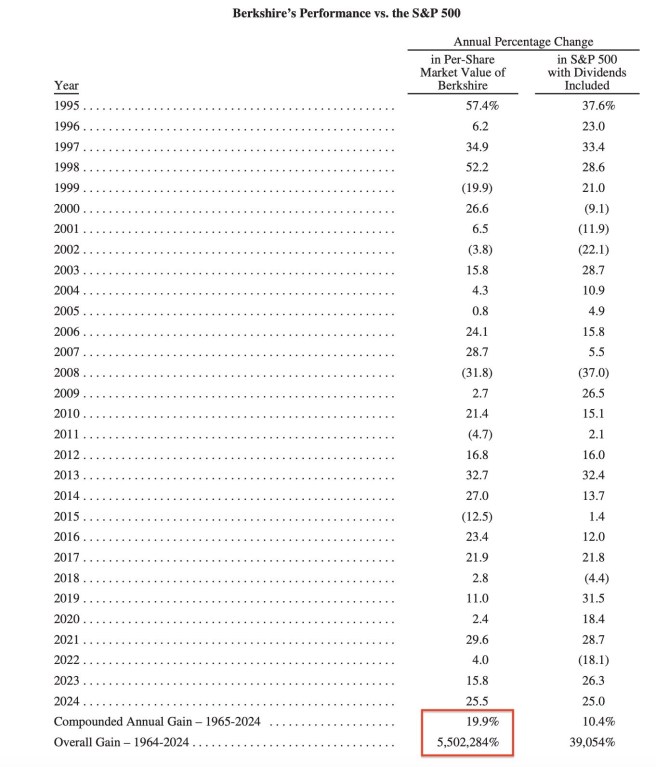 Das ist also auch für mich interessant – Berkshire Hathaway hatte eine Performance von 1965 (mein Geburtsjahr) bis 2024 von durchschnittlich 19,9% und der S&P 500 von zumindest 10,4%.