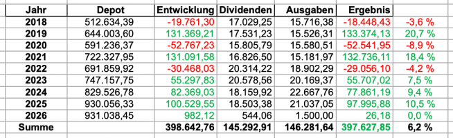 Deshalb habe ich meine E/A-Auswertung ein klein wenig erweitert. Von 2018, das ist mein erstes gesamtes Jahr in der finanziellen Unabhängigkeit bis 2026 also 8 Jahre komme ich auf 6,2% 🥂
