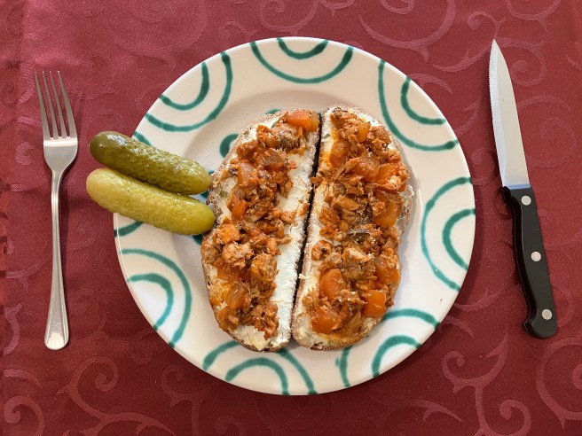 Schnelle Küche im Weinviertel, getoastet wurden 2 Brotscheiben, Knoblauchaufstrich und Makrelen im Backrohr 🐟