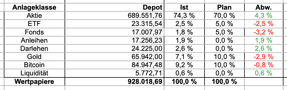 Zuerst meine Anlageklassen ergeben rd. 74% Aktien…
