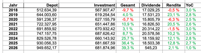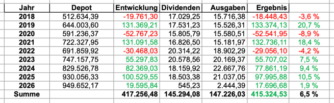 Nun aber zum ersten Monat 2026, der verlief aber gut, Zurückhaltung in meinem „Mischfonds“ okay, d.h. wenig Veränderung im Portfolio, trotz Turbulenzen bei Mr. Market nochmals ein All Time High auf 950K 🥂