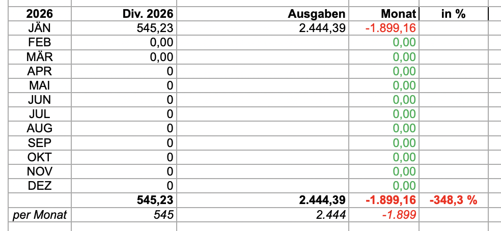 Die Ausgaben im Dezember waren wie immer zum Jahreswechsel höher. Dieses Monat gab es Ausgaben von 2.444,39 EUR. Der Februar wird vom Einkommen auch vergleichbar gering. Geduld und warten auf die 1K und Jahresdividenden im März 😎