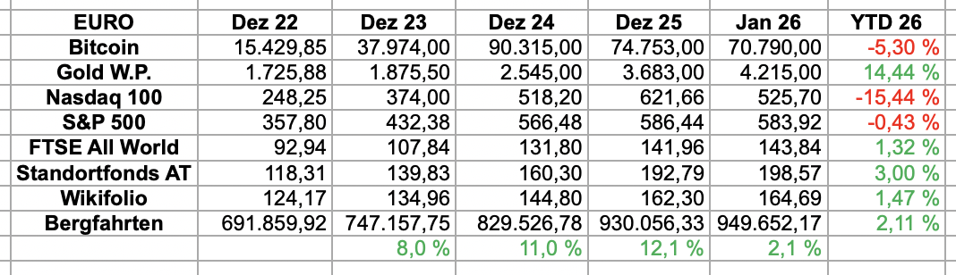 Mein Bergfahrten Portfolio steigt das vierte Jahr in Folge nach +8% in 2023, +11% in 2024, +12% in 2025 und nun +2,1% für 2026. Persönlicher reminder – ein grüner Start in das Neue Jahr 🍀