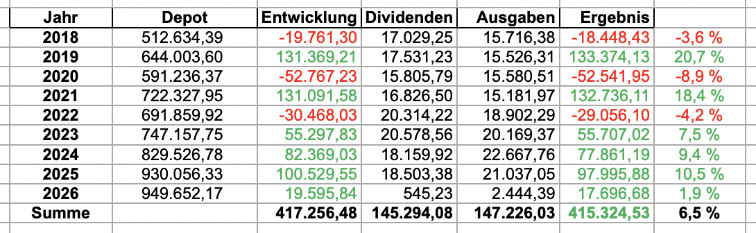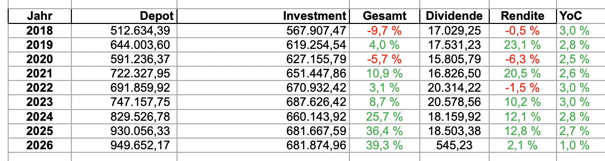 Nun aber zum ersten Monat 2026, der verlief aber gut, Zurückhaltung in meinem „Mischfonds“ okay, d.h. wenig Veränderung im Portfolio, trotz Turbulenzen bei Mr. Market nochmals ein All Time High auf 950K 🥂