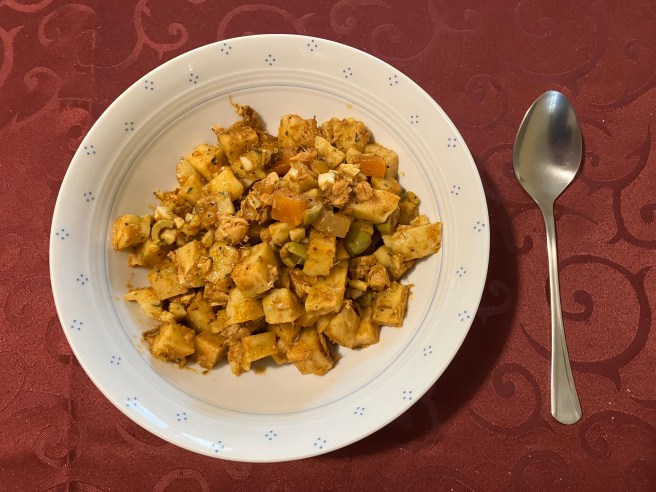 Reste kochen, aus 2 Semmelknödel, 1 Dose Makrelen-Salat, Gewürze, Oliven und Knoblauch 🧄