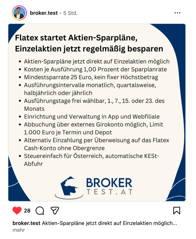 Mit Anfang Februar hatte Flatex AT ihre Dienstleistungen erweitert. Es werden Sparpläne für Aktien angeboten. Danke an Andreas Greiner für die Info…