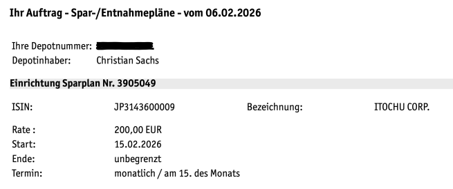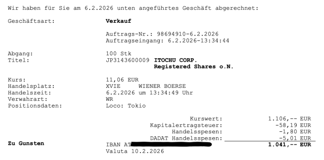 Der Aktiensplitt von 1:5 wurde von der Dadat nicht zufriedenstellend durchgeführt. 2024 habe ich dort ein Depot eröffnet wegen Aktien-Sparplänen. Ärger brachten die Depotüberträge dorthin (mehrfach Depotpositionen wie nun bei Itochu) und auch die Sparpläne waren zuletzt instabil und bedurften Nachfragen.